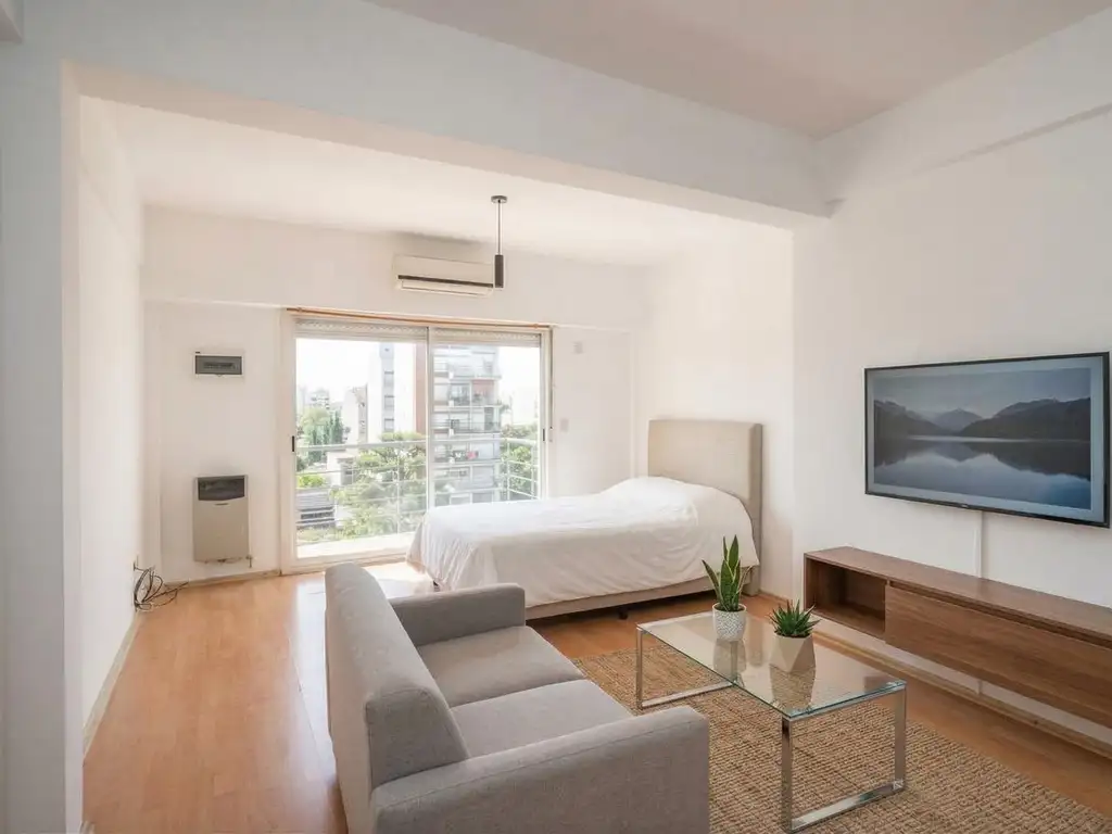 Es un monoambiente muy luminoso en un 7mo piso que mira a un pulmón de manzana abierto, por lo que recibe muchísima luz y tiene una muy linda vista. Cuenta con una cocina integrada, baño completo con ducha, y un amplio balcón. Tiene un placard que fue agregado. Además posee una cochera propia descubierta.