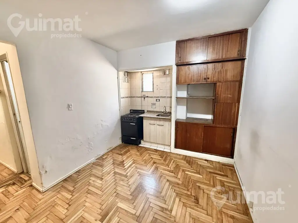 En pleno Barrio de Once, 1 cuadra Av. Pueyrredón (Subte H), Av. Cordoba y 3c. Av. Corrientes (Subte B), Departamento Monoambiente en 2o Piso a pulmón, actualmente muy bien dividido en 2, ya que del ambiente se ha hecho la división con modular hacia el Living y placard hacia dormitorio que tiene una muy amplia ventana con luz. Se ingresa por pequeño hall de entrrada, baño, ambiente dividido con cocina integrada con muebles bajos y artefacto de cocinar convenional, agua caliente central, distintos muebles para almacenar artículos y ropa (muy bien aprovechados y ganados al ambiente). Los pisos son de parquet en el ambiente y ceramicos en baño. Ideal para vivienda o renta. EXCELENTE PRECIO.