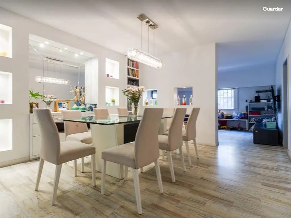 La cocina ha sido reciclada y está equipada con una ventana que da acceso a un amplio patio interno techado con vidrio, donde se encuentra una parrilla a gas, ideal para reuniones familiares. El living, con su elegante piso de piedra travertino, ofrece un ambiente luminoso y acogedor.