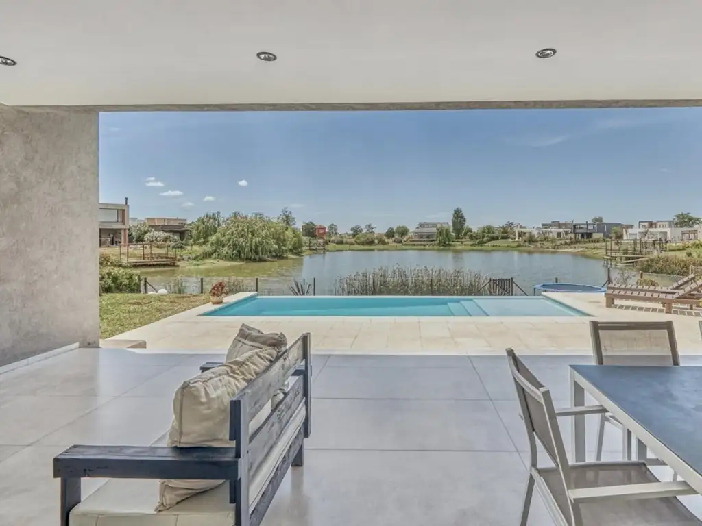 PB: Gran Living comedor con hogar 9,35 x 4,30 y Mueble para Led Smart de hasta 65 pulgadas.Gran Cocina 4,45 x 4,60 con Isla desayunador integrado.Toilette 2,10 x 1,90 minimalista.Despensa 2,50 x 1,80 separada de la cocina.Lavadero 2,50 x 1,60 con, muebles de guarda y caldera dual.1 Habitación de Huéspedes 2,50 x 3,00 con baño completo 2,40 x 1,10.1 Habitación principal Master suite de 40mts2 con vestidor equipado, baño con jacuzzi y ducha, con vista a la laguna y salida al parque.1 Dormitorio 4,10 x 2,80 con entrada desde el exterior independiente (posible consultorio y/o oficina) con placard e interiores.1 Dormitorio 4,10 x 2,90 con una cama para niños (se puede agregar un colchón) con placard e interiores1 Baño completo con bañera de 2,05 x 2,20.1 Jardín de invierno con salida independiente desde habitaciones secundarias.1 Guarda utiles de exterior de 3 x 3 con luz.PA:Estudio o habitación de 3,85 x 3,50. Balcón con porcelanato con vista a laguna de 5,00 x 8,00 (con ducha de agua fría y caliente y desagüe cloacal para hacer otra habitación.Balcón con porcelanato a Frente 8,60 x 3,50GALERÍAGalería de 8,05 x 5.00.Gran Parrilla y bacha independiente.Baño completo de 2,60 x 1,30.Piscina con fondo infinito de 3,00 x 9,00 de con playa húmeda y luces led.Solarium atermico de 25mt2Amplio Fogonero con vista a la laguna.Terreno aterrazado frente a laguna de 100mts2Salida prevista para el muelle.EXTERIORIluminación perimetral de la casa seccionada con sensores automáticos.Iluminación de fondo y plantas ornamentales con sensores automáticos.Escalinata de entrada de cemento alisado.CocheraEntrada vehicular techada para 2 vehículos 7,00 x 3,00 techada + entrada vehicular destechada para 4 autos.
