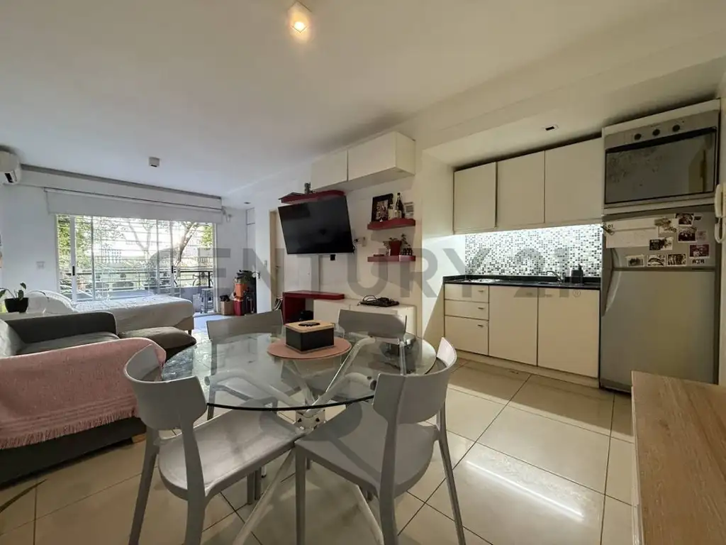 La unidad cuenta con ambiente único, cocina integrada, baño completo y balcón al frente, ideal para disfrutar del aire libre. Dispone de calefacción central, lo que garantiza confort durante todo el año.