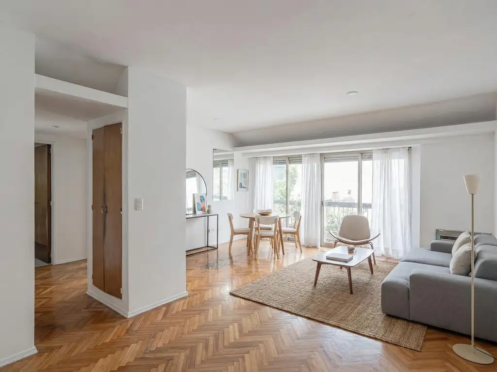 La propiedad se ubica al contrafrente, con vista abierta a pulmón de manzana, lo que garantiza silencio y buena luminosidad. Living comedor, dos dormitorios con buen espacio de guardado, dos baños completos y dependencia de servicio con su propio baño, cocina y lavadero separado. Distribución amplia y versátil, ideal para modernizar y adaptar a un estilo actual.