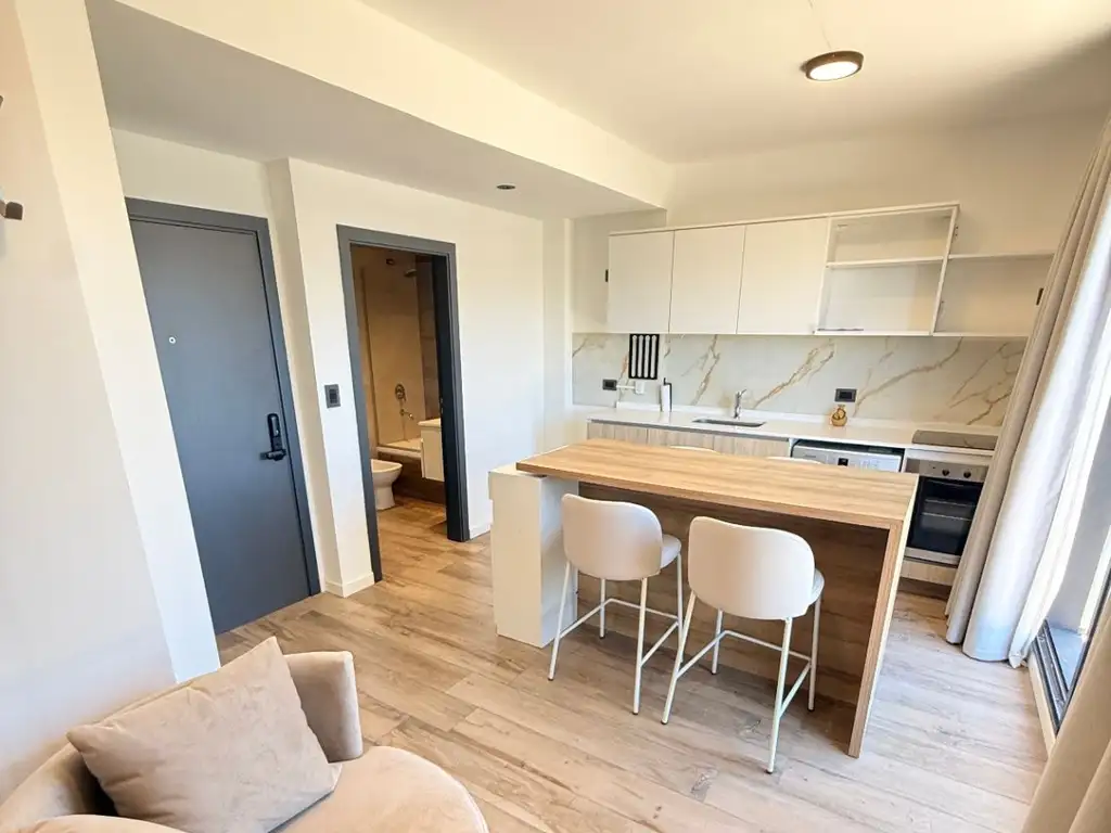 La cocina se integra al ambiente, con muebles completos (alacena y bajo mesada), mesada de Silestone.