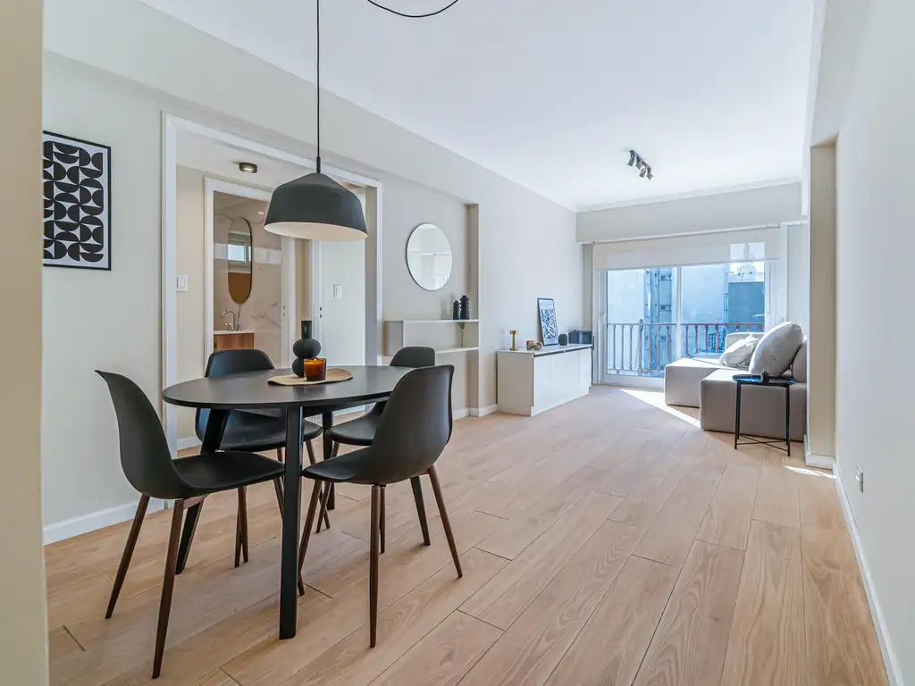 Al ingresar, el departamento se presenta con una distribución funcional y ambientes bien definidos. Los pisos de porcelanato simil madera aportan calidez y una estética actual que acompaña el mobiliario moderno incluido, tal como se aprecia en las fotos.