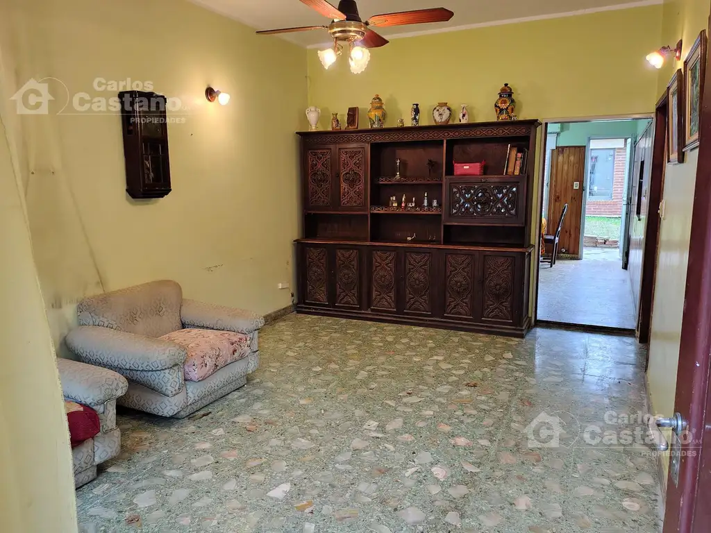 En la entrada gran Patio de 8,66x3,5m (tiene tanque de agua nuevo); Living-Comedor de 6x3,5m sobre pisos de mosaico; 2 cómodos cuartos con placares: 1o Dorm. de 4x3,6m con ventana al fondo y 2o Dorm. de 4,5x3,6m con ventana al Patio del frente; Baño; Hall de 0,9x2m; Cocina/Comedor de 5x3,5m salida al fondo propio de 8,66x8m (Patio y Jardín); en el fondo Dependencia de Servicio con Baño o puede ser cuarto de huéspedes; Lavadero; entrada pasante de servicio al fondo; Sótano en la Cocina.