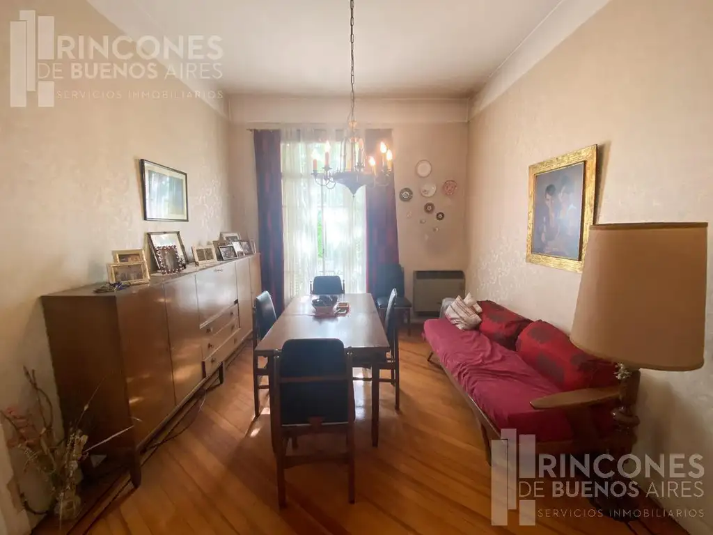 Al ingresar, encontramos un gran living comedor con salida al balcón, vista al jardín y pisos de pinotea originales en excelente estado.