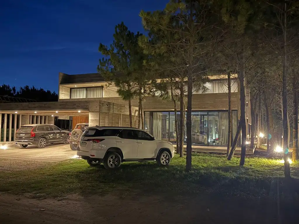 Gran parrilla con frente de acero inoxidable con Horno Tromen, barra y amplia galeria con vista al bosque, desde donde se pueden apreciar bellos atardeceres y disfrutar de las vistas nocturnas con una iluminación que da notas magicas tanto a la casa como al entorno.