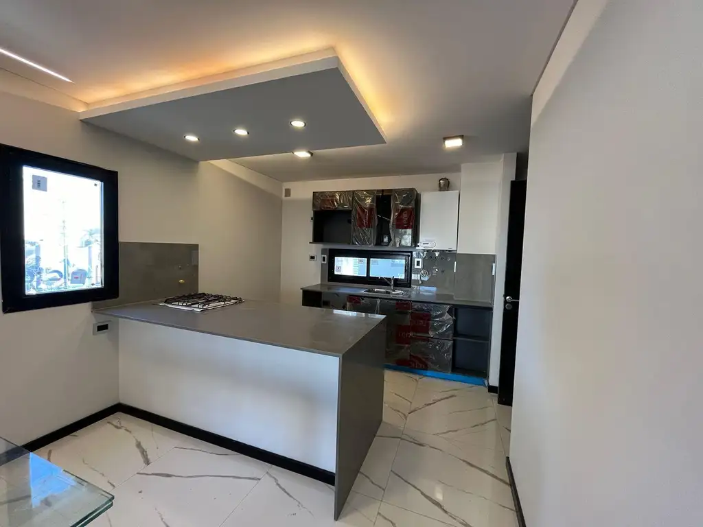 - Cocina semi integrada, equipada con alacena y bajo mesada, marca Reno.