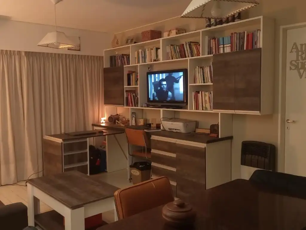 El living es amplio y luminoso. Cuenta con un mueble de diseño moderno hecho a medida que sirve de rack multimedia, espacio de guardado, biblioteca y escritorio. Allí se encuentra conectado un calefactor. Posee un amplio ventanal con persiana de enrollar y cortinas y conduce al balcón corrido.