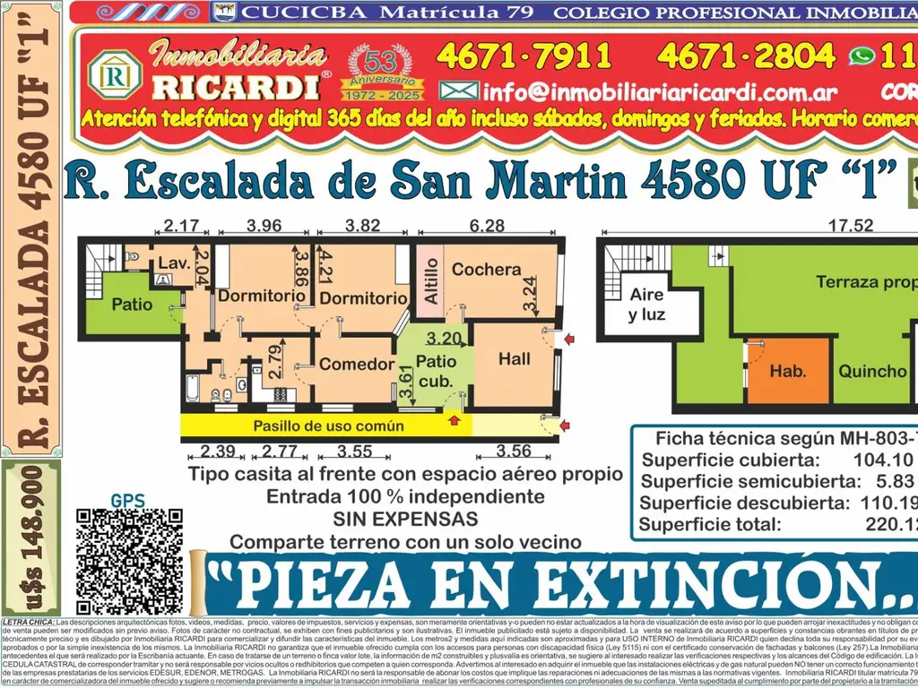 La Inmobiliaria RICARDI NO garantiza que el inmueble cumpla con el certificado de conservación de fachadas y balcones (Ley 257) tampoco efectúa el estudio de títulos, ni analiza los alcances del Código de edificación y no será responsable por los vicios ocultos o redhibitorios que competen a quien corresponda. Advertimos al adquirente que las instalaciones eléctricas, de gas natural y-o sanitarias pueden NO solo no tener un correcto y adecuado funcionamiento técnico sino que además puede NO cumplir con las exigencias actuales de METROGAS- EDESUR- EDENOR - siendo a cargo del adquirente que implique su puesta en valor y-o funcionamiento.