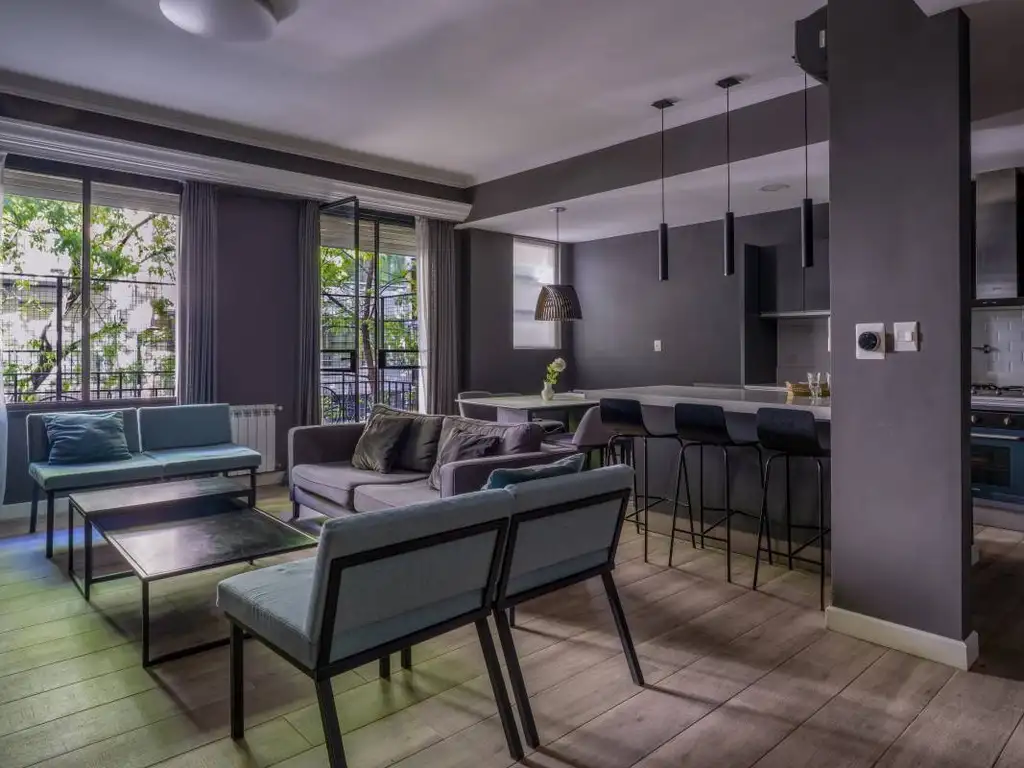 Living comedor con cocina integrada, moderna y funcional.