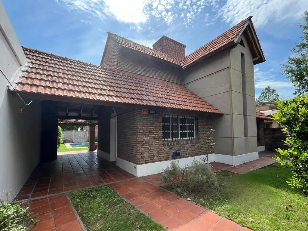 Dispone de 2 dormitorios,2 baños (1 de recepción), living, cocina con comedor y lavadero, galería en ele con parrillero, mesada, lavabo y cochera. En su exterior jardín con piscina.
