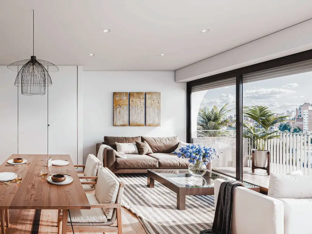 Ingreso a un amplio estar-comedor con luminosidad destacada y salida a balcón corrido al frente, ideal para disfrutar del entorno urbano y la cercanía al río.