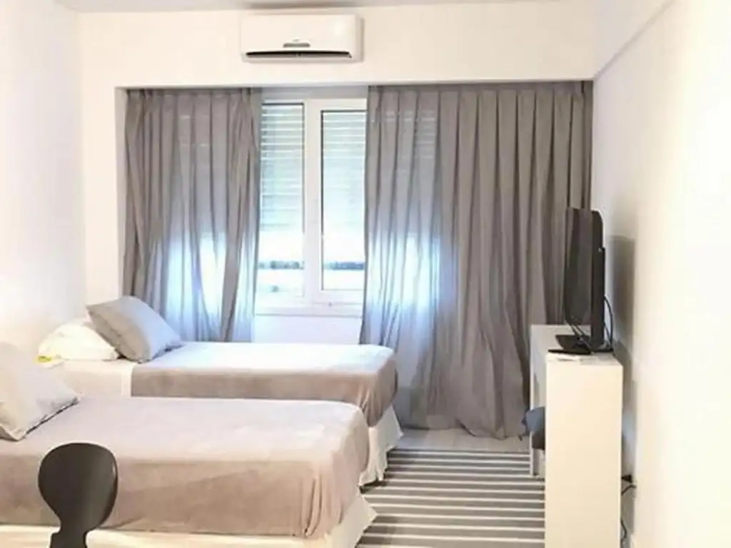 Amplio ambiente divisible. Comedor diario. Balcón. 2 camas singles que se pueden unir en una cama doble. Amplios placares espejados.
