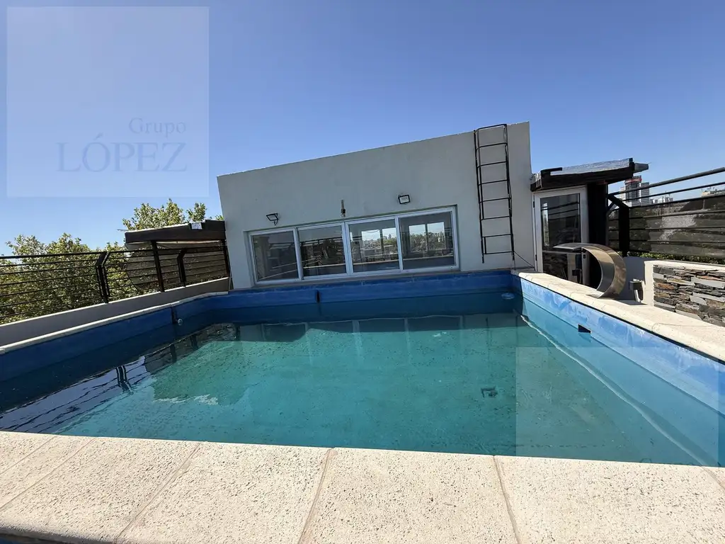 Amplísimo semipiso, terraza, con cesped artificial, gran piscina de 4,5 x 5,5, quincho, baño. Primer planta amplio living comedor pisos porcelanato, gran cocina con comedor diario, muy amoblada y equipada, balcón con parrilla, baño completo. Segunda planta 2 dormitorios con placar, el principal con vestidor, baño completo compartimentado, con hidromasaje, patio con lavadero. dormitorios con balcones. Tercer planta con piscina, terraza quincho y baño. 2 cocheras cubierta y semicubierta. Excelente calidad, pisos porcelanato, calefacción por losa radiante con caldera dual, carpintería aluminio doble vidrio, puerta blindada, todo el departamento enrejado. grandes espacios libres. bajas expensas.