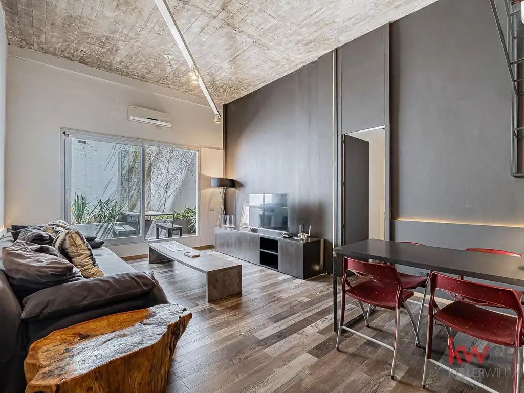 - Amplio living-comedor integrado con techos de hormigón a la vista