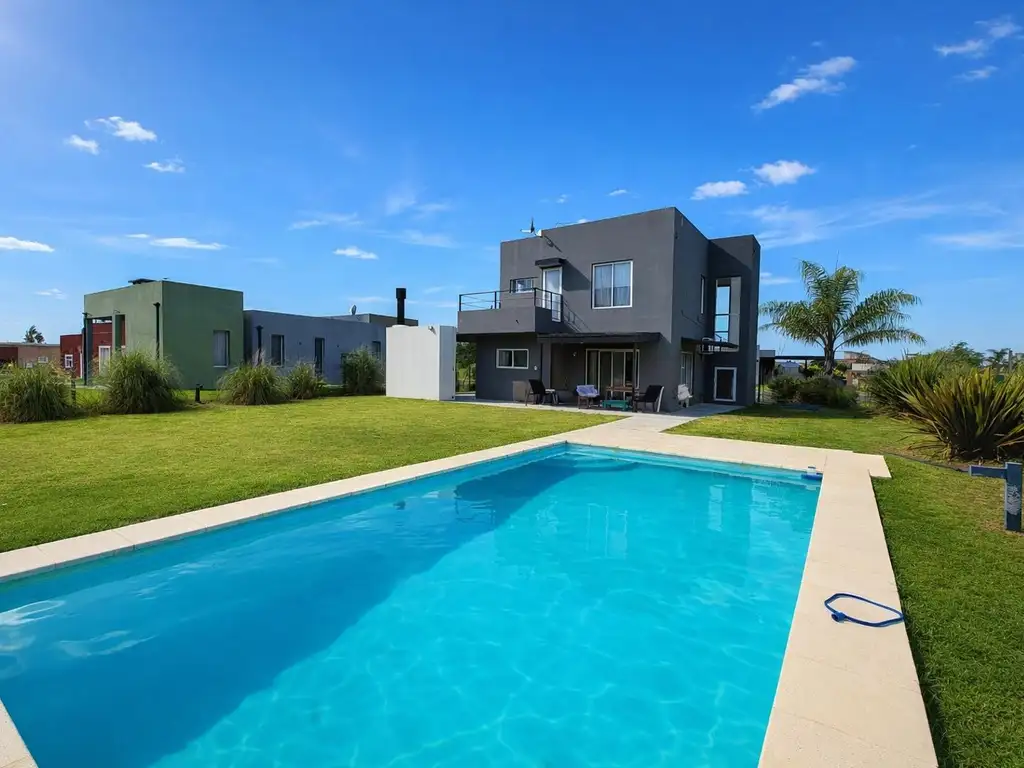 La casa cuenta con una superficie construida de 185 m² y una distribución funcional y moderna. En planta baja se desarrolla un amplio y luminoso living, comedor y cocina integrados, generando un espacio social cómodo y abierto, con visuales al jardín y salida directa al sector de galería y pileta. La cocina se encuentra equipada con buen espacio de guardado y mesadas de generosas dimensiones. En esta planta también se ubica un dormitorio, ideal para huéspedes, escritorio o playroom, un baño completo y lavadero independiente.