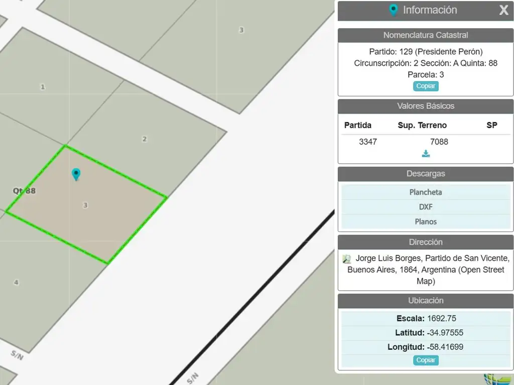 Partido: 129 (Presidente Perón), Circunscripción: 2, Sección: A, Quinta: 88, Parcela: 3, Partida 3347