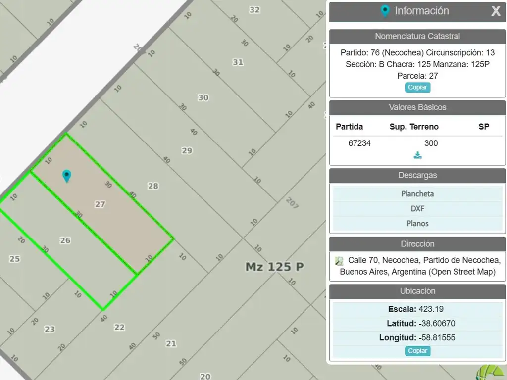 Datos Catastrales Partido: 76 (Necochea), Circunscripción: 13, Sección: B, Chacra: 125, Manzana: 125P, Parcela: 27 y 26