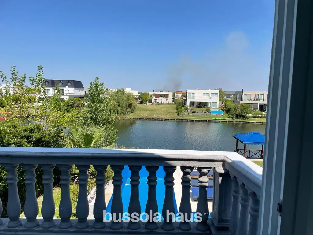 Desde el área social se accede a una galería con parrilla a gas, cerramiento, y conexión directa al jardín. El exterior ofrece pileta con vista al lago, baño para pileta y sistema de riego automático.