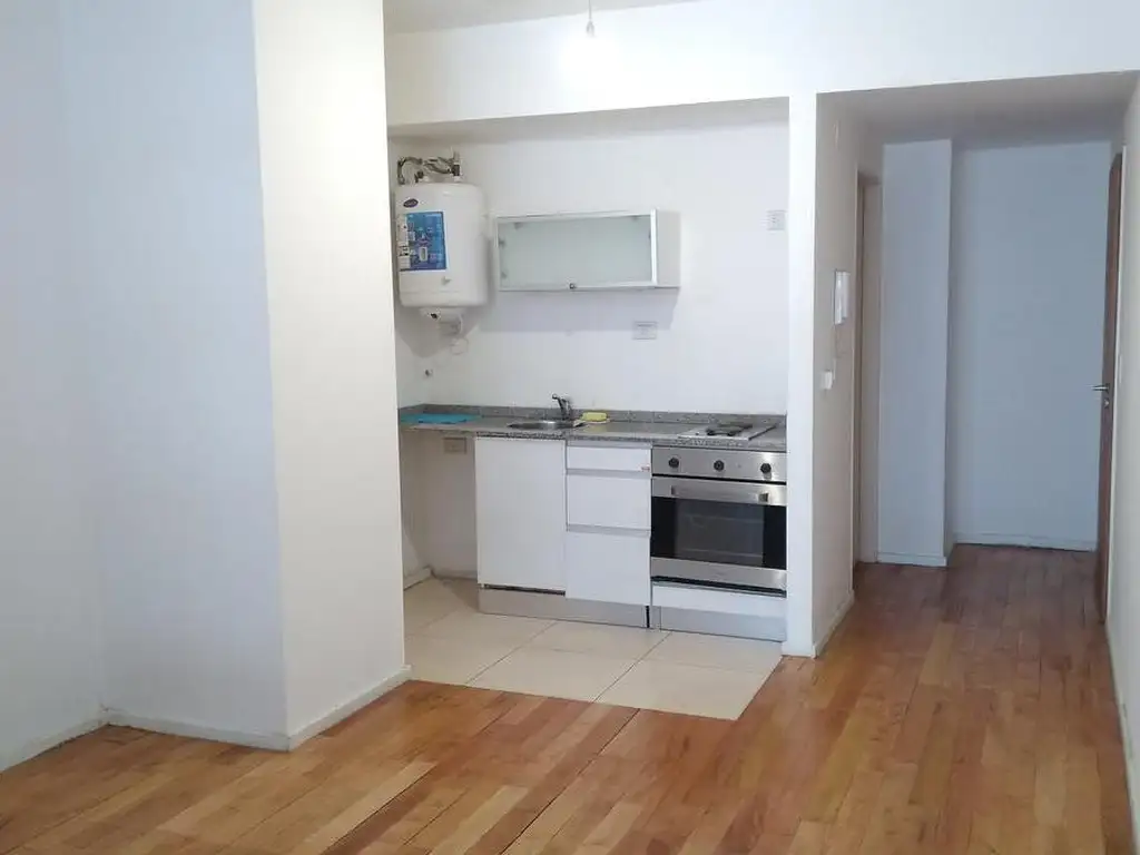 Cocina integrada, artefacto de cocina eléctrico, conexión para lavarropas, calefón eléctrico y calefacción por losa radiante con medidores individuales.