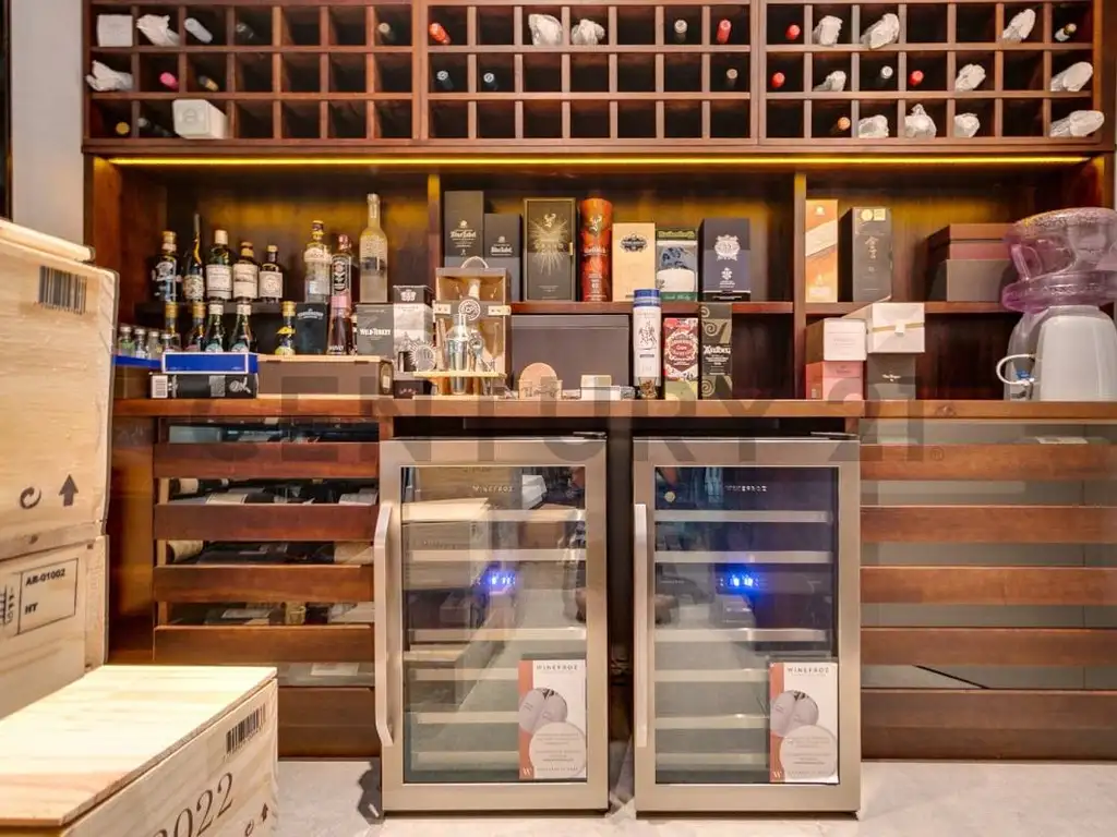 El living–comedor se presenta como uno de los grandes protagonistas de la casa: amplio, luminoso y con una cava vidriada refrigerada, que aporta carácter y distinción al espacio social. La climatización central VRV permite regular la temperatura de manera eficiente y personalizada en todos los ambientes.