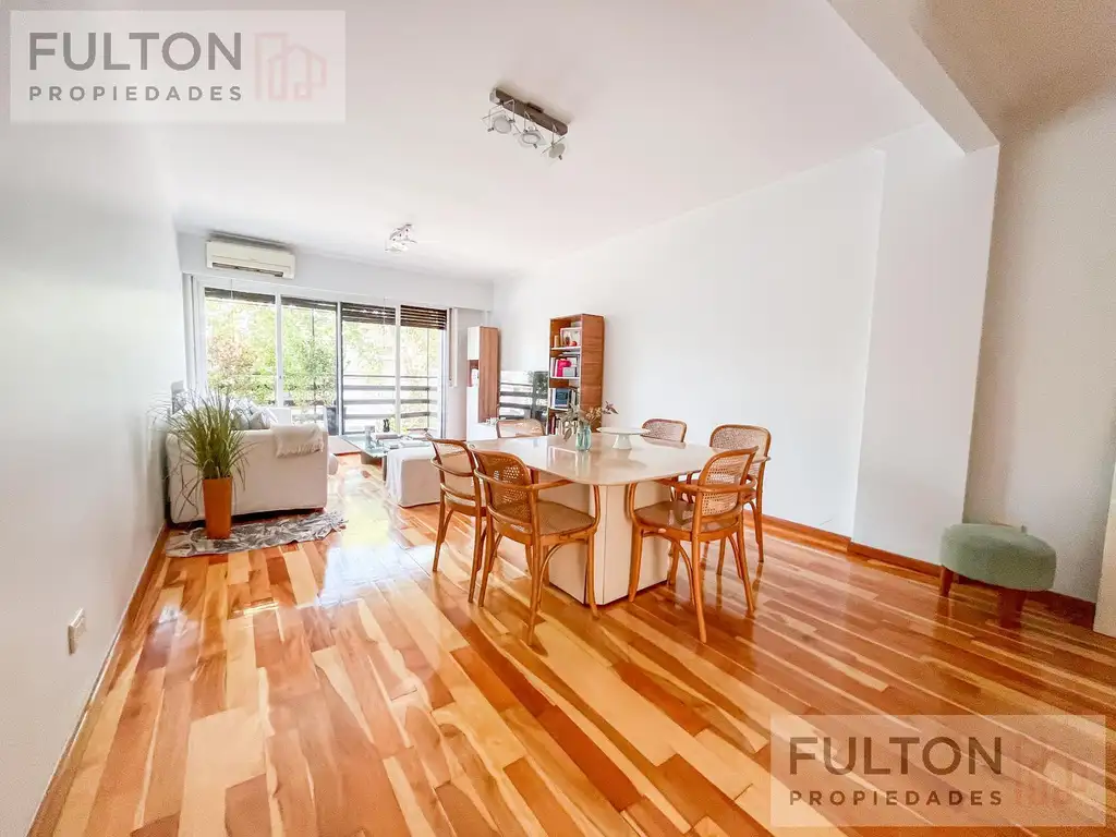 La unidad se desarrolla en un piso completo. Al ingresar por la puerta principal se accede a un amplio living comedor, muy luminoso, con salida a un balcón corrido al frente.