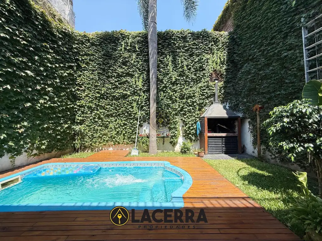 Ubicado en planta baja, accedemos a un living amplio, seguido por baño de servicio, dos dormitorios ambos con placares embutidos ( uno de ellos con entrepiso de madera para utilizar como un ambiente mas y el otro con vestidor ), baño completo con antebaño y espacio de guardado con bañera, cocina separada con isla/ desayunador de mármol integrado con la mesada y muebles completos de madera en excelente estado de conservación, desde la cocina con ventanales al exterior, nos encontramos con galería semi cubierta y garage para tres vehículos, desde el garage también accedemos a galería y fondo del inmueble, el mismo de 60 m2 con piscina de fibra de vidrio y parrilla.