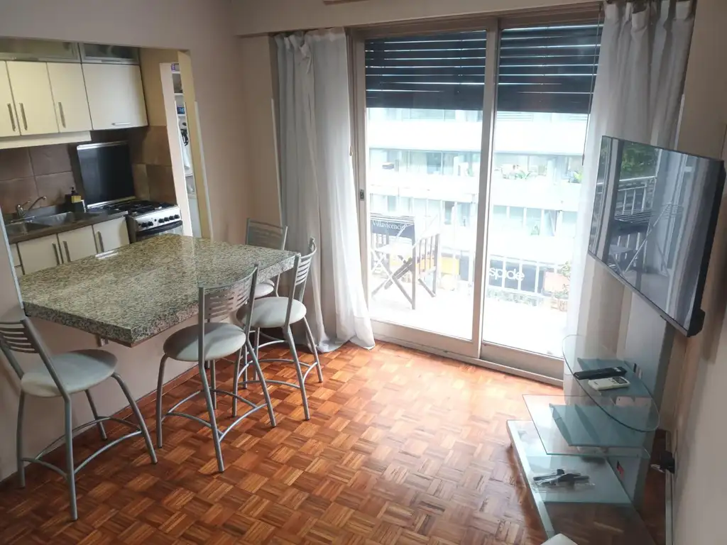 LIVING: sofá cama de 1,90 x 1,40, una mesada desayunador integrada al living, con 4 banquetas, Aire Acondicionado, TV smart de 40", Puerta Ventana con salida al Balcón, puf, silla de exterior.