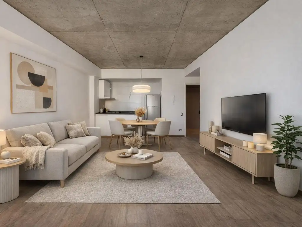 - Ambientes principales con piso cerámico, enlucido de yeso en paredes y cielorrasos de hormigón a la vista