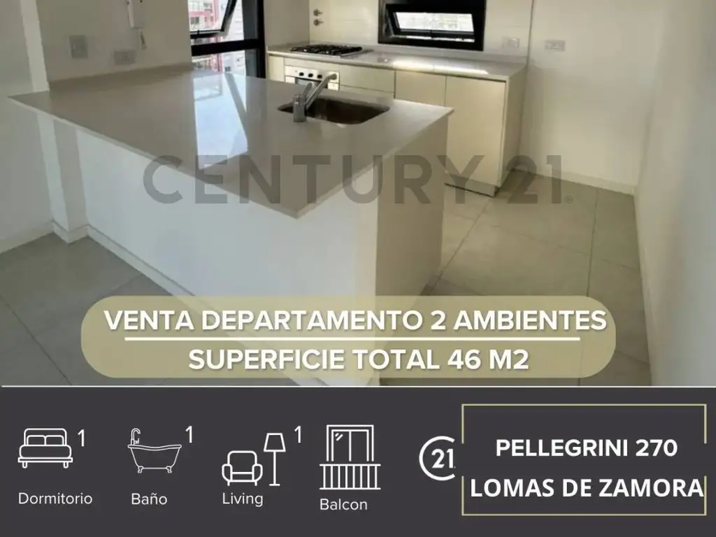 Moderno departamento de 2 ambientes con cocina integrada, muy luminoso y a estrenar, ubicado en una excelente zona de Lomas de Zamora, sobre calle Pellegrini 270.