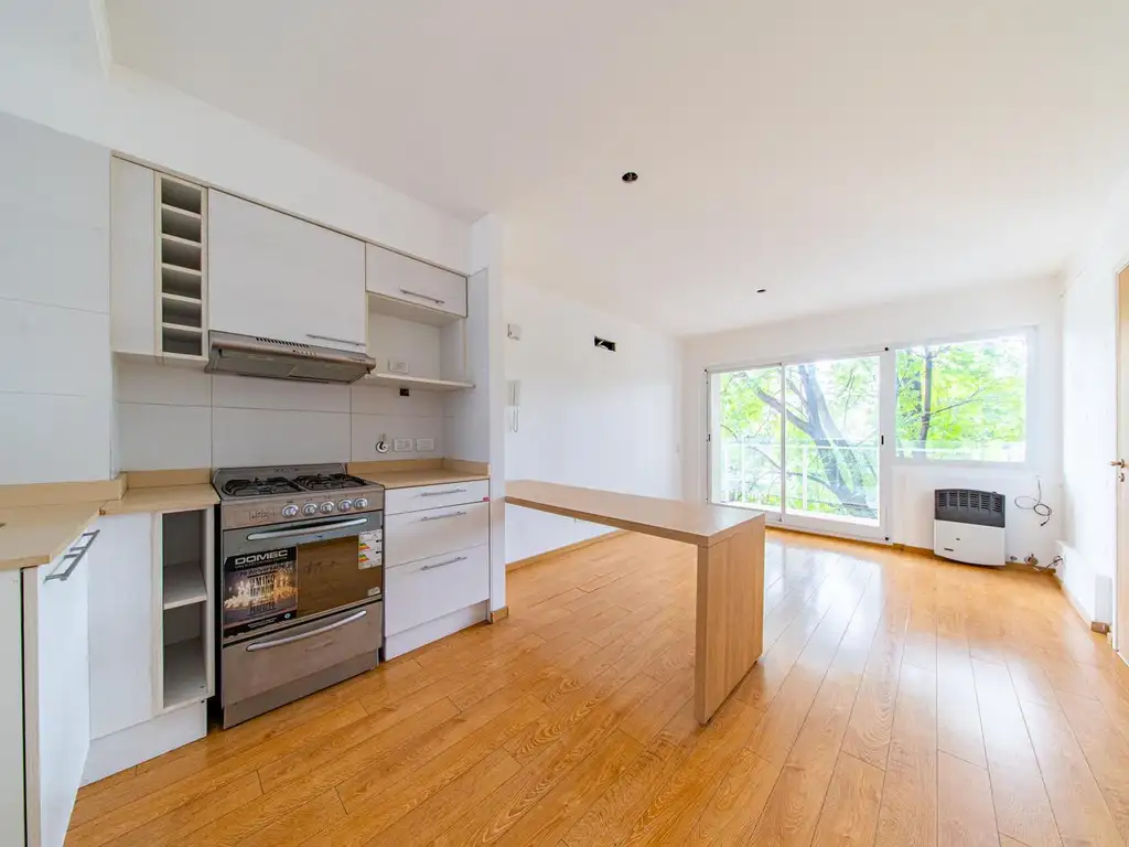 TIPOLOGíA: Ambiente único dividido en zona de facultades. Cuenta con un gran balcón al frente, cocina integrada al living comedor y un balcón al contrafrente con conexión para lavarropas. Tiene ventilación cruzada.