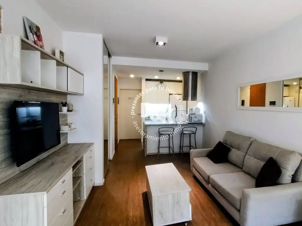 Living comedor con acceso a un buen balcon corrido, luminoso. La cocina está integrada con desayunador y conexión para lavarropas. Placard empotrado. Baño de gran tamaño.