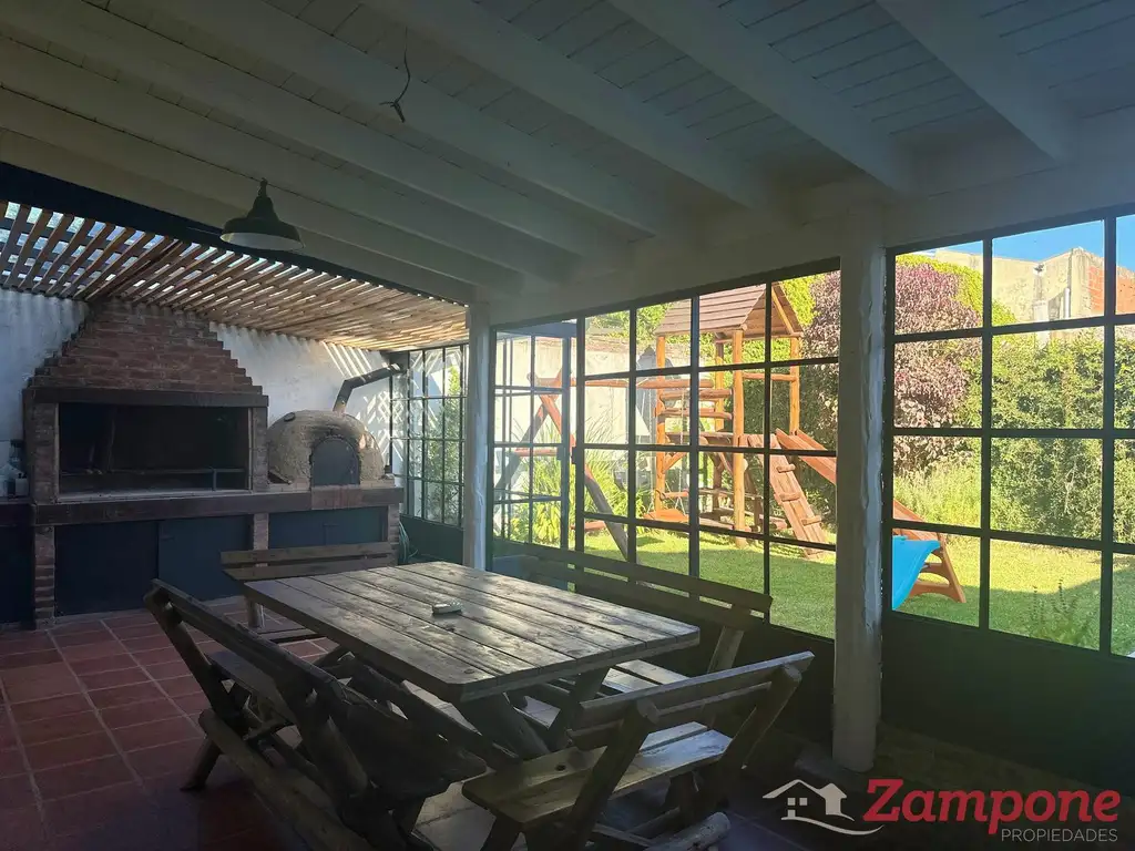 Consta en su planta baja de un gran Hall de recepción integrado con la sala de estar y acceso directo al garaje, cuenta también con baño completo. Cocina completa con todos los muebles sobre y bajo mesada. Comedor diario con puerta de salida directa al jardín y amplios ventanales con vista al mismo. El jardín cuenta con galería semi- cubierta, parrilla, horno de barro y jardín de fondo, lavadero cubierto.