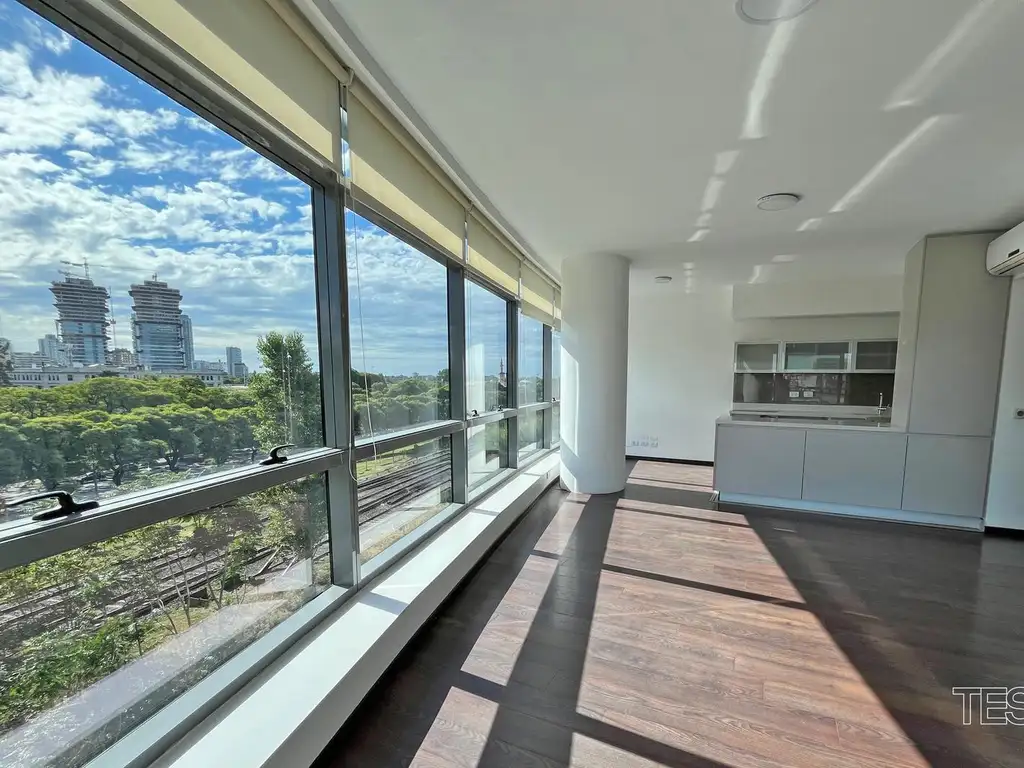 Piso alto con excelente luz y vista. Living comedor. 2 dormitorios. 1 en suite con vestidor. 2 baños completos. Toilette. Cocina integrada con office. Balcón aterrazado. Lavadero independiente. Cochera fija. Pileta, gimnasio, cancha de tenis, SUM, spa, business center y juegos para niños. Vigilancia 24hs.