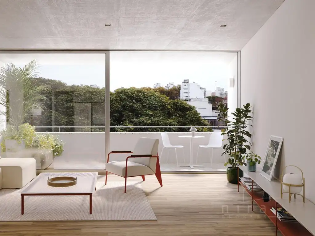 Unidad de 2 ambientes al contrafrente con excelente iluminación natural, living de dimensiones únicas y un balcón de 8,9 m2 con espacio para huerta.