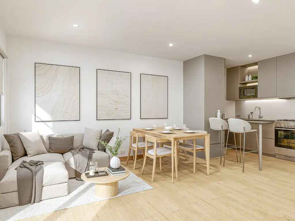 Una vez que ingresamos a la unidad, nos encontramos en living comedor, con cocina integrada, y salida a balcón. Pisos y zócalos de porcelanato rectificado tipo tabla simil madera, muebles bajo mesada y alacenas en melamina de diseño, mesadas de mármol negro en muebles de cocina y barra. Revestimiento salpicadero en pared sobre mesada en porcelanato. Bacha doble de acero inoxidable. Artefacto cocina a gas. Cortinas blackout al frente que conservan el buen gusto estético del edificio. Preinstalación de aire acondicionado. Estufa tiro balanceado.