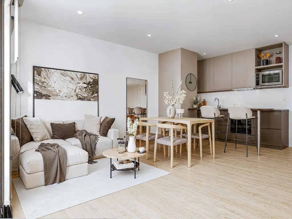 Una vez que ingresamos a la unidad, nos encontramos en living comedor, con cocina integrada, y salida a balcón. Pisos y zócalos de porcelanato rectificado tipo tabla simil madera, muebles bajo mesada y alacenas en melamina de diseño, mesadas de mármol negro en muebles de cocina y barra. Revestimiento salpicadero en pared sobre mesada en porcelanato. Bacha doble de acero inoxidable. Artefacto cocina a gas. Cortinas blackout al frente que conservan el buen gusto estético del edificio. Preinstalación de aire acondicionado. Estufa tiro balanceado.