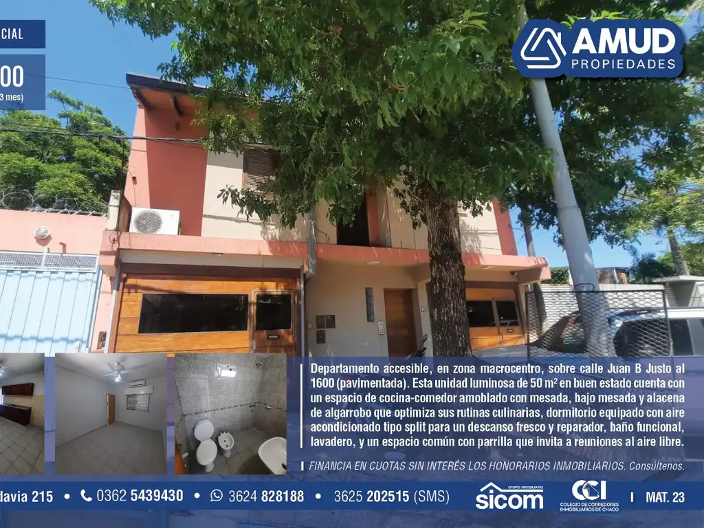 En cuanto a las comodidades, esta unidad luminosa de 50 m² en buen estado cuenta con un espacio de cocina-comedor amoblado con mesada, bajo mesada y alacena de algarrobo que optimiza sus rutinas culinarias, dormitorio equipado con aire acondicionado tipo split para un descanso fresco y reparador, baño funcional, lavadero para mayor practicidad, y un espacio común con parrilla que invita a reuniones al aire libre.
