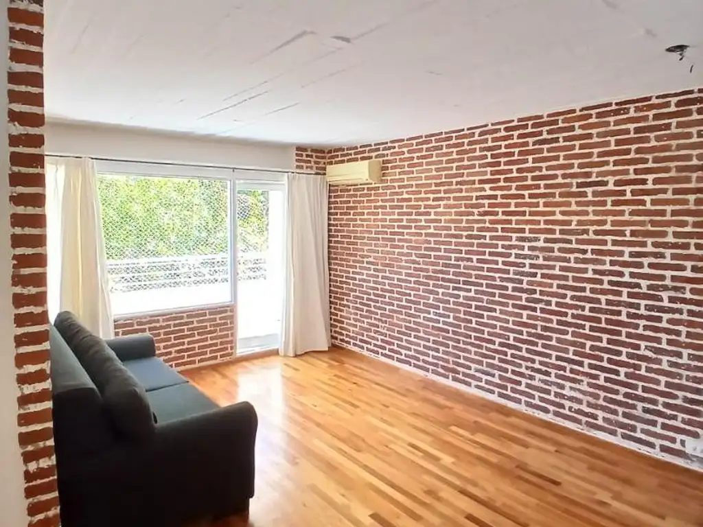 - Living: piso de madera, paredes revestidas en ladrillos y salida al balcón al frente, ventilacion cruzada, Aire Acondicionado