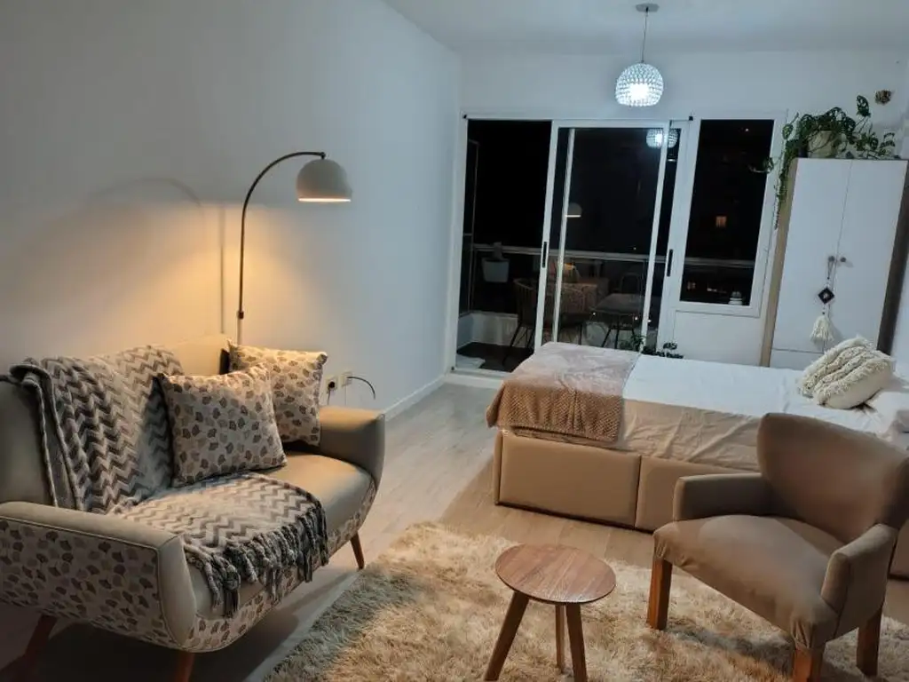 El ambiente está diseñado con un estilo moderno y funcional, integrando cocina con barra desayunadora, espacio de living y área de descanso, logrando amplitud y confort.