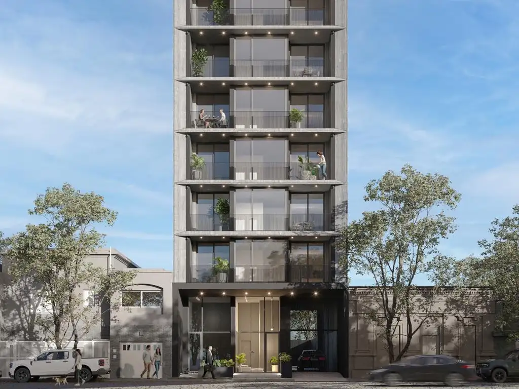 El edificio se desarrolla en 9 niveles con solo 18 semipisos, lo que garantiza privacidad y confort. Su arquitectura de líneas puras y presencia sobria incorpora hormigón visto como material protagonista, logrando una estética moderna que dialoga con el carácter del barrio.