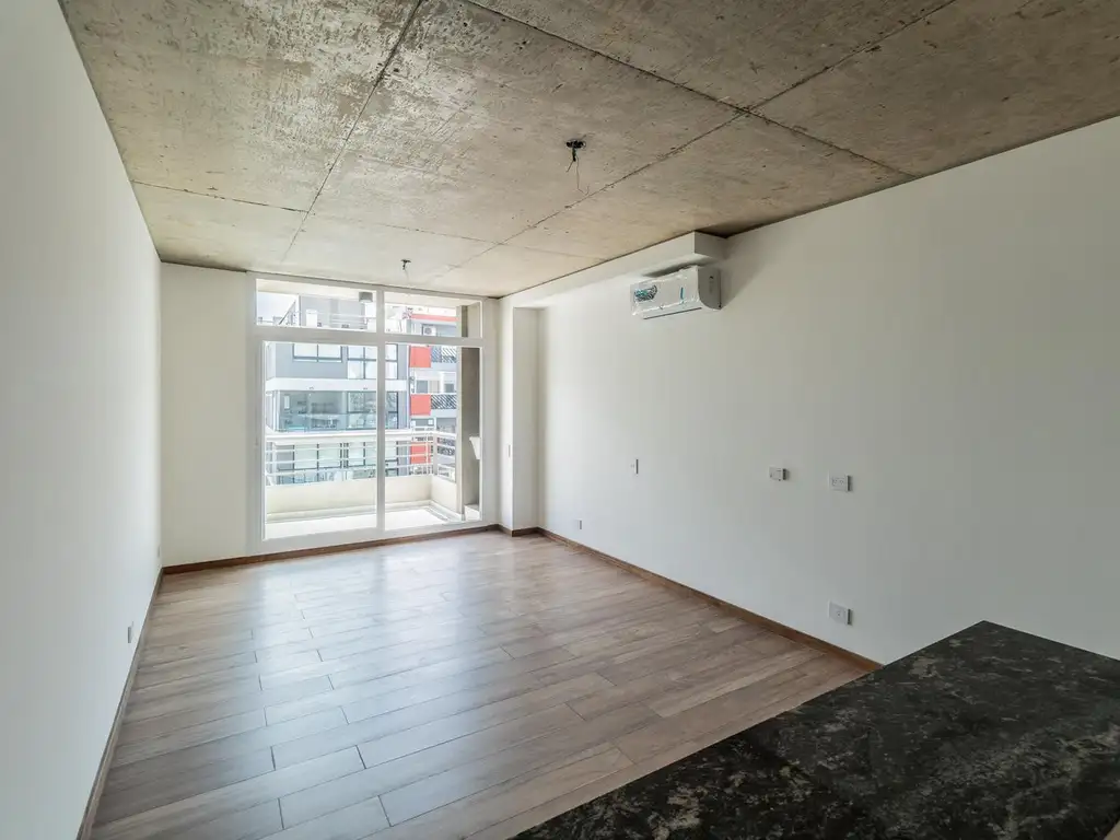 El departamento cuenta con carpinterías de aluminio y piso cerámico. Cielorraso de hormigón a la vista tanto en el interior como en el balcón, que también ofrece espacio para lavadero y una excelente vista abierta. El baño es completo y está equipado con extractor. La cocina americana cuenta con muebles de melamina y una mesada de granito gris perla, además de un purificador, anafe eléctrico con 2 hornallas y cocina eléctrica. Se entrega con fondo de placar.
