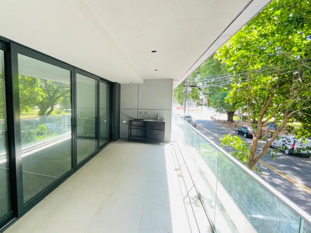 Balcón aterrazado de 6,65 x 2,40 m con parrilla estilo Kamaro y vista abierta.