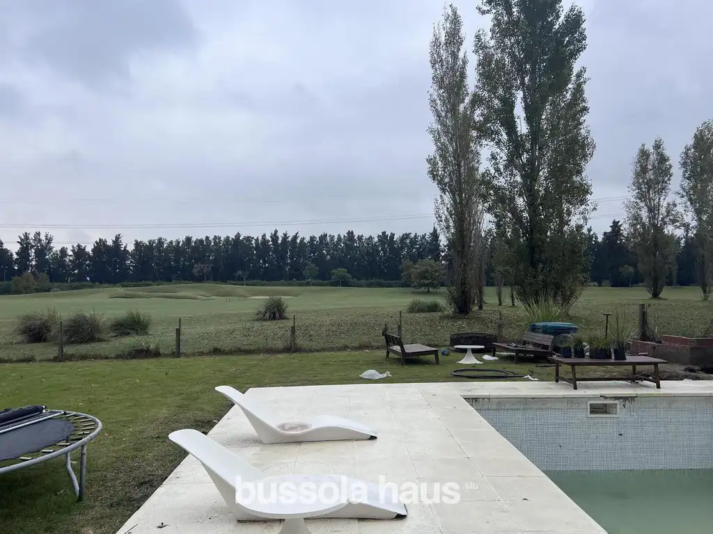 El exterior se presenta como un espacio central para el disfrute: galería con hogar revestido en piedra, pileta con playa húmeda y solárium, y un jardín totalmente parquizado, todo acompañado por vistas abiertas y permanentes al campo de golf.