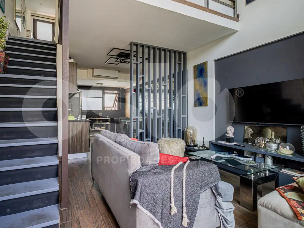 Este moderno departamento de dos ambientes se destaca por su luminosidad y diseño en doble altura.