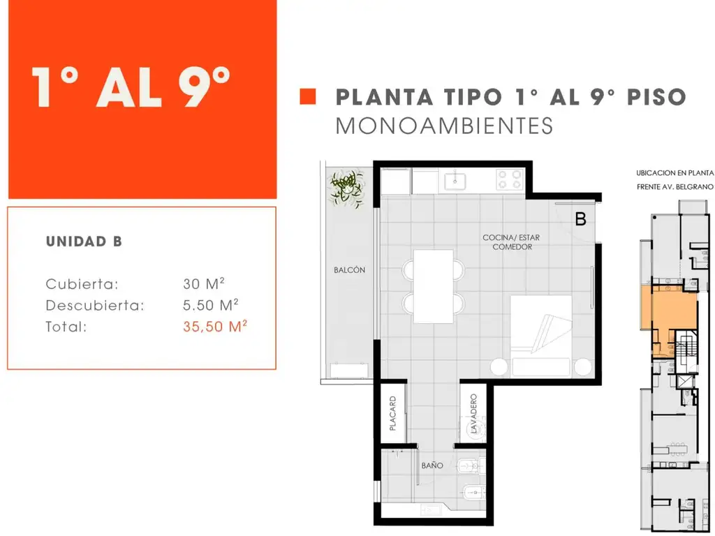 Con una superficie total de 35.5 m2, este departamento de un dormitorio y un baño es ideal para quienes buscan un espacio práctico y acogedor. La orientación oeste garantiza que la luz natural inunde el lugar, creando un ambiente luminoso y cálido.