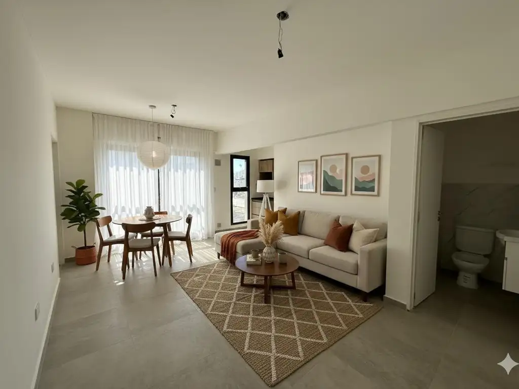 Al ingresar, la unidad recibe con un living comedor amplio, muy luminoso y con salida al balcón, ubicado en un 7o piso, lo que garantiza vistas abiertas y una excelente entrada de luz natural.