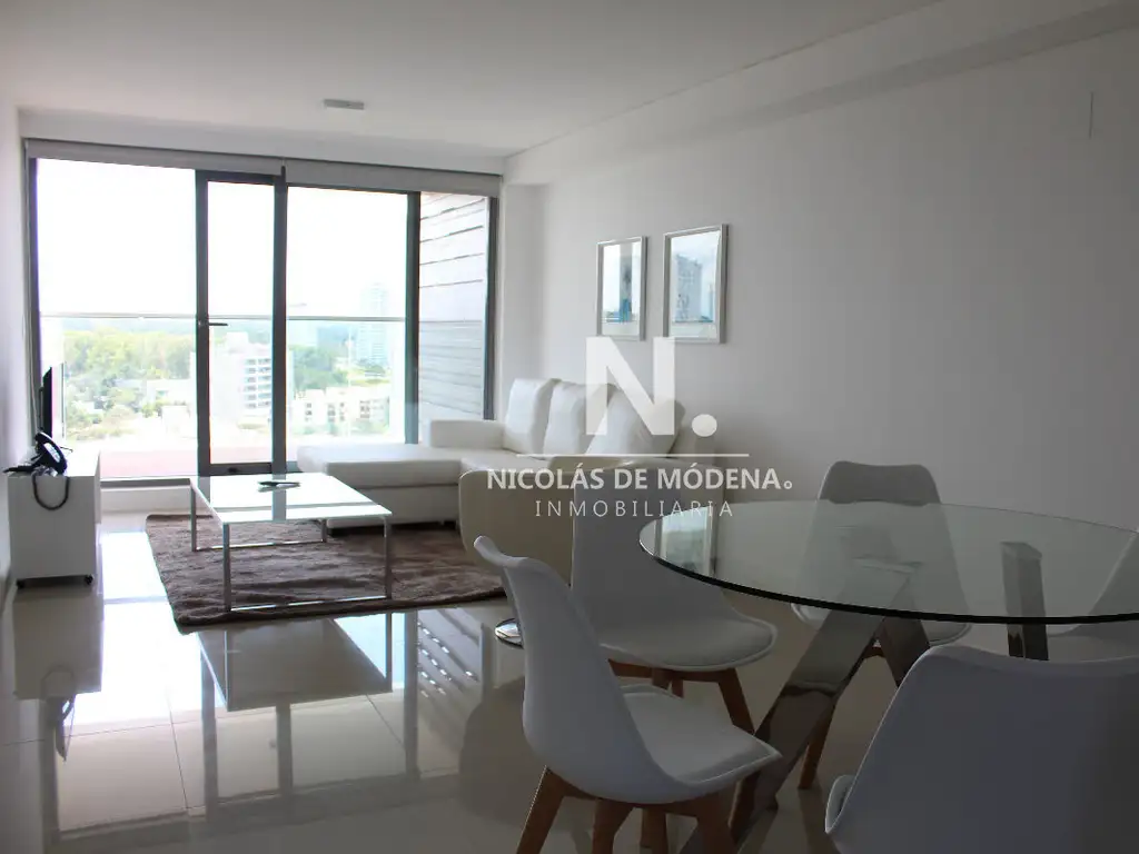 Cocina semi integrada con barra, living, comedor y balcón al frente.
