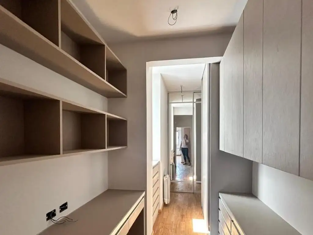 Amplio placard en pasillo distribuidor con paneles corredizos de piso a techo e Interiores totalmente terminados con cajoneras, estantes y barrales.